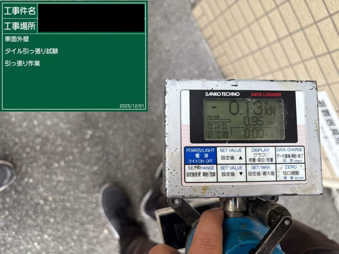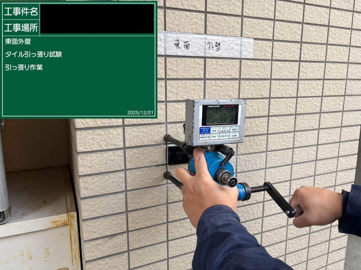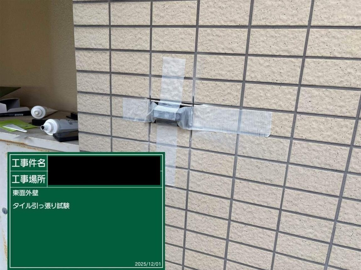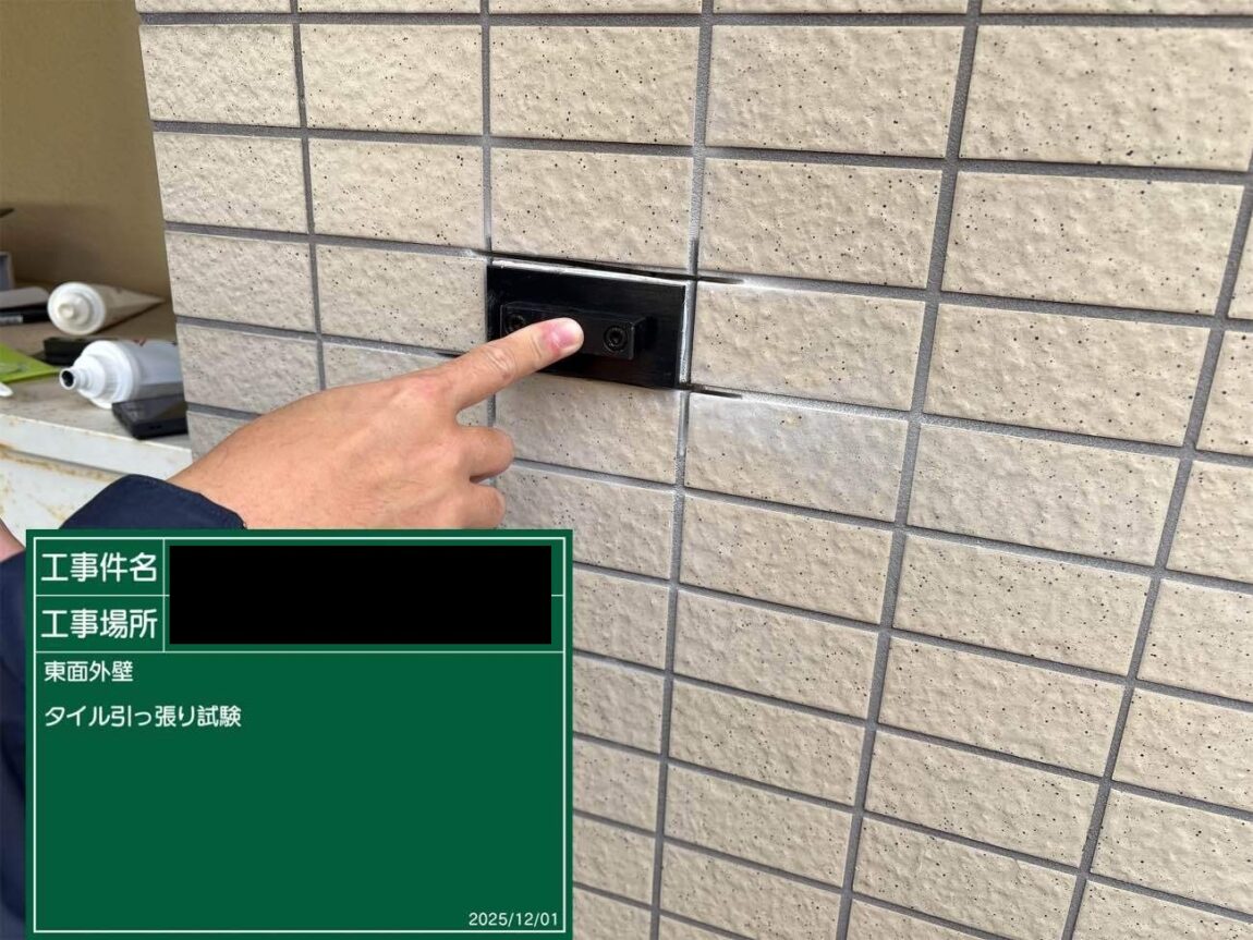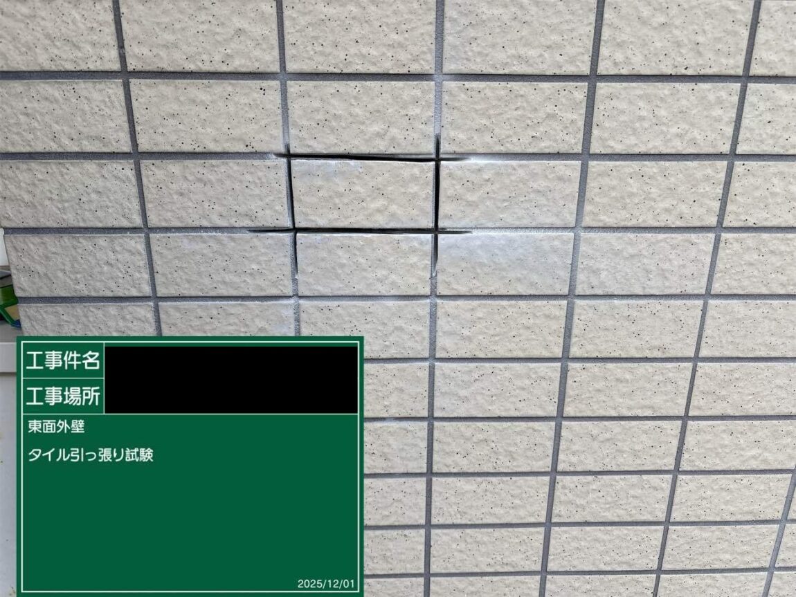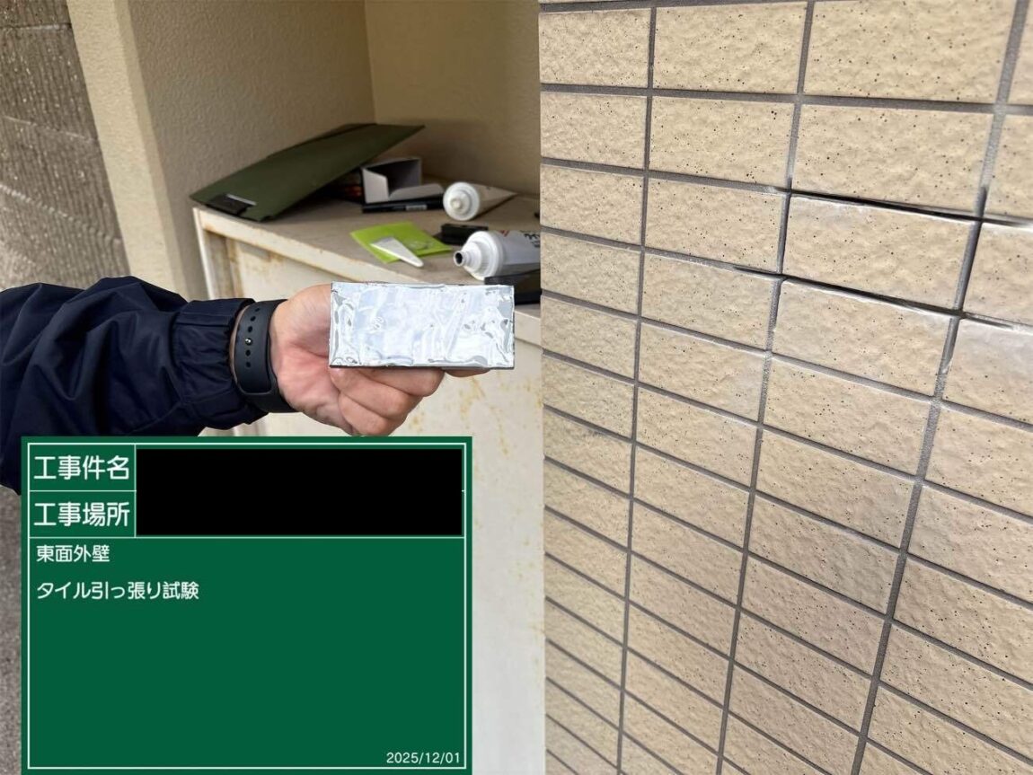 今回は、マンションの修繕工事の前に、タイルがしっかり付着しているかの、タイルの「引張接着強度試験」についてご紹介させていただきます。