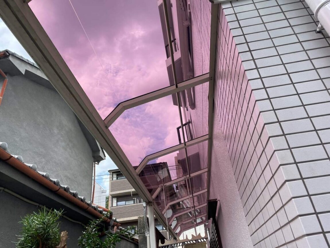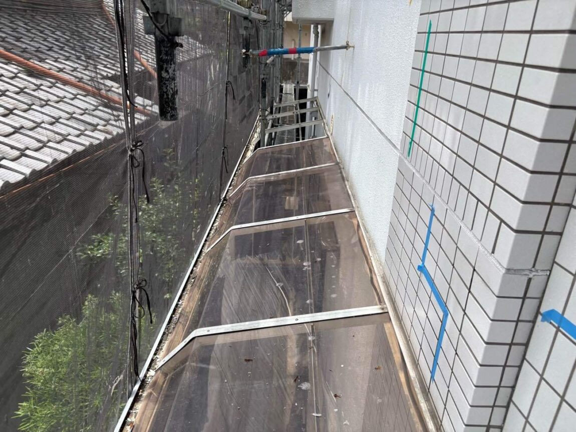 元々のポリカの屋根が劣化していたのと、一部ポリカにひび割れがあったこともあり、マンションをきれいにするのと合わせてポリカの屋根を交換することになりました。